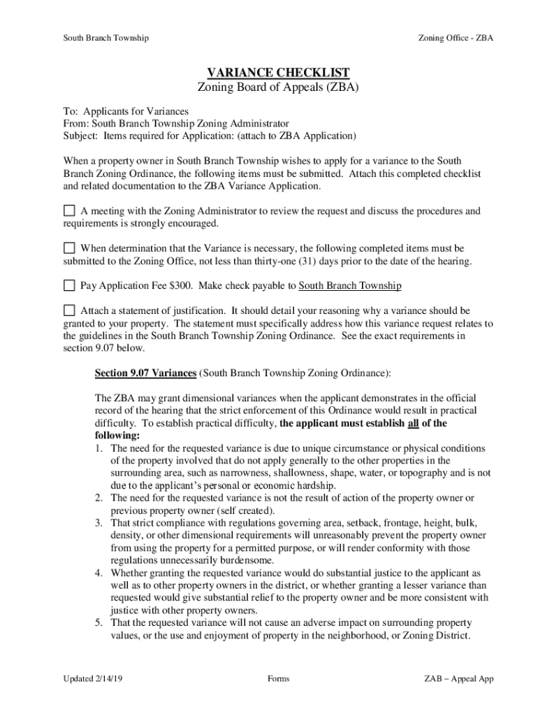 South Branch TownshipZoning Office VARIANCE CHECKLIST Zoning Board of Appeals (CBA) To: Applicants for Variances From: South Branch Township Zoning Administrator Subject: Items required for Application: