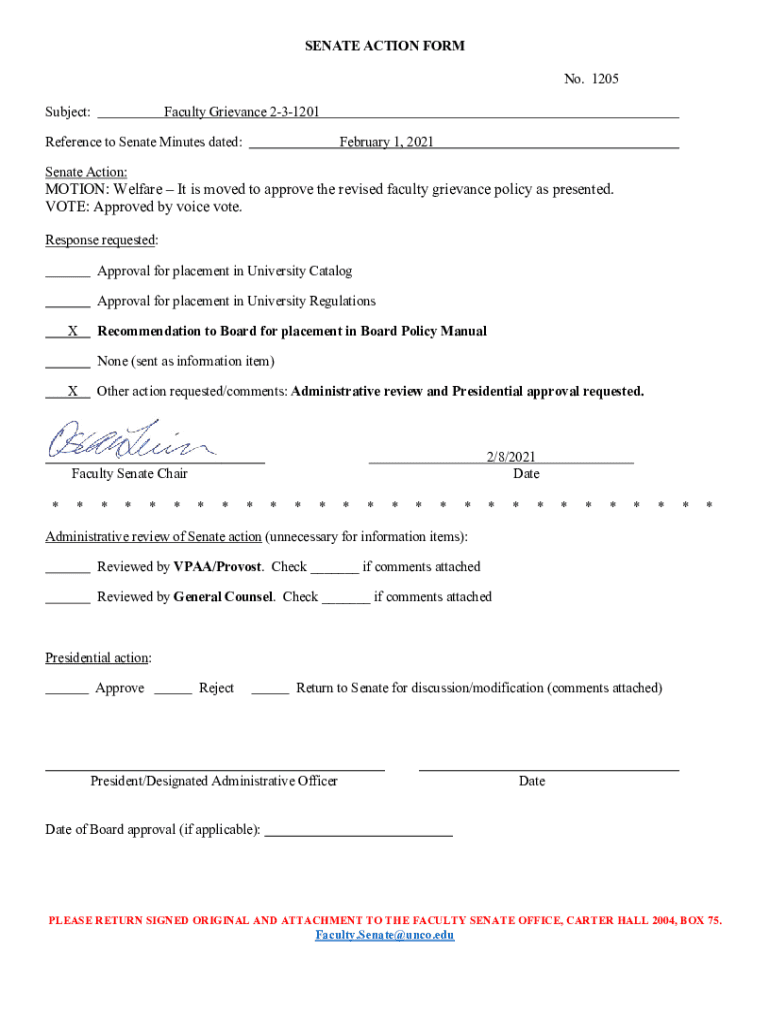 SENATE ACTION FORM No. 1205 Subject:Faculty Grievance 231201Reference to Senate Minutes dated:February 1, 2021Senate Action:MOTION: Welfare It is moved to approve the revised faculty grievance policy