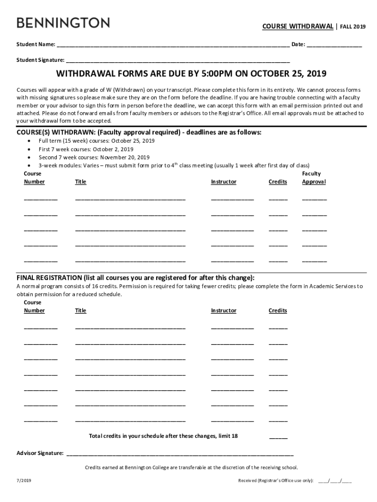 COURSE WITHDRAWAL FALL 2019 Student Name: Date: Student Signature: WITHDRAWAL FORMS ARE DUE BY 5:00PM ON OCTOBER 25, 2019, Courses will appear with a grade of W (Withdrawn) on your transcript. Please
