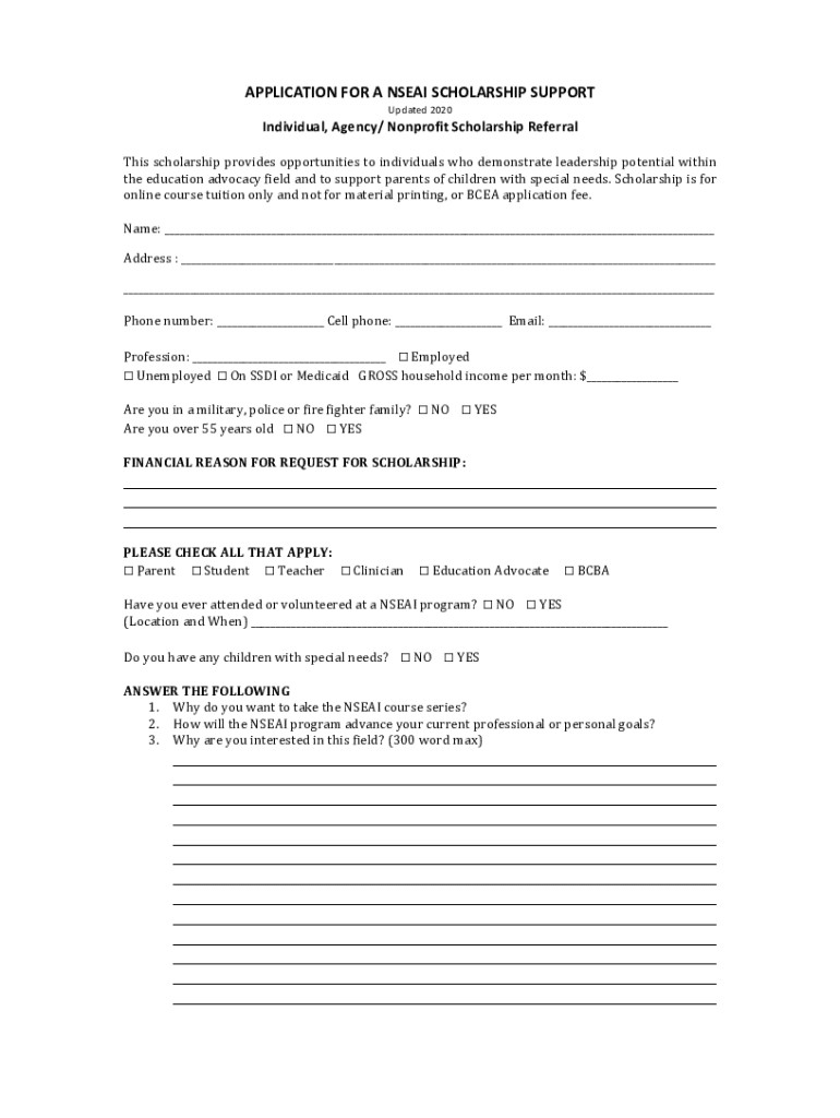 APPLICATION FOR A NS EAI SCHOLARSHIP SUPPORTUpdated 2020Individual, Agency/ Nonprofit Scholarship Referrals scholarship provides opportunities to individuals who demonstrate leadership potential within
