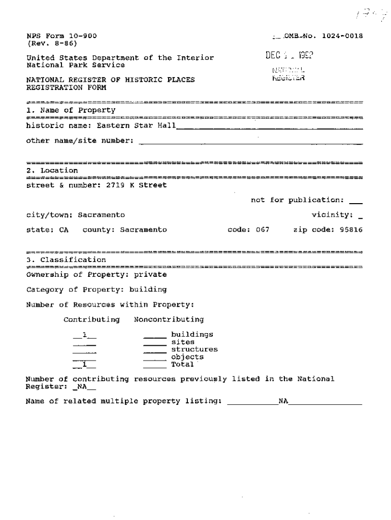 NFS Form 10900 (Rev. 886)10240018United States Department of the Interior National Park Service NATIONAL REGISTER OF HISTORIC PLACES REGISTRATION FORM1. Name of Property historic name: Eastern Star