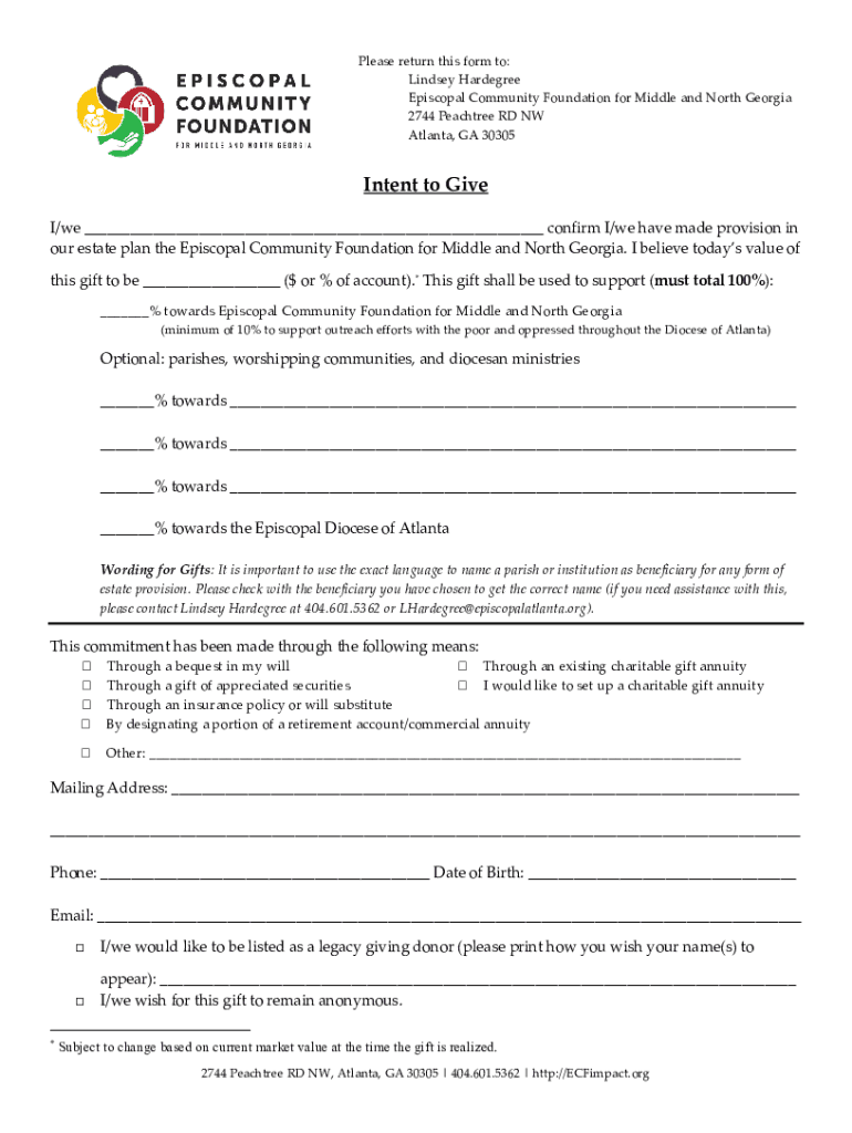 Please return this form to: Lindsey Degree Episcopal Community Foundation for Middle and North Georgia 2744 Peach tree RD NW Atlanta, GA 30305Intent to Give I/we confirm I/we have made provision in