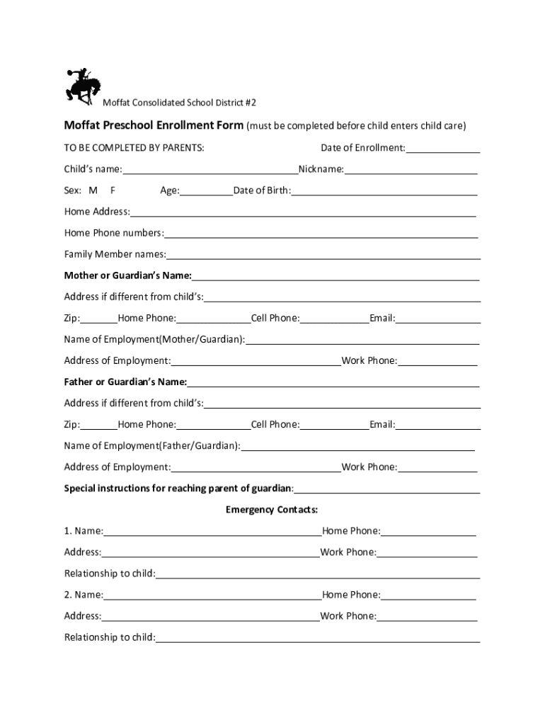 Moat Consolidated School District #2Moffat Preschool Enrollment Form (must be completed before child enters child care) TO BE COMPLETED BY PARENTS:Date of Enrollment: Child's name: Nickname: Sex: