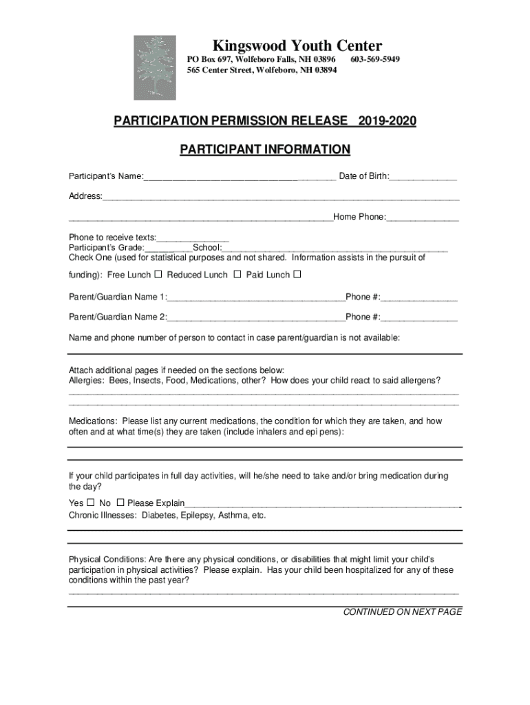 Kings wood Youth Center PO Box 697, Goldsboro Falls, NH 03896 565 Center Street, Goldsboro, NH 038946035695949PARTICIPATION PERMISSION RELEASE 20192020 PARTICIPANT INFORMATION Participants Name: Date