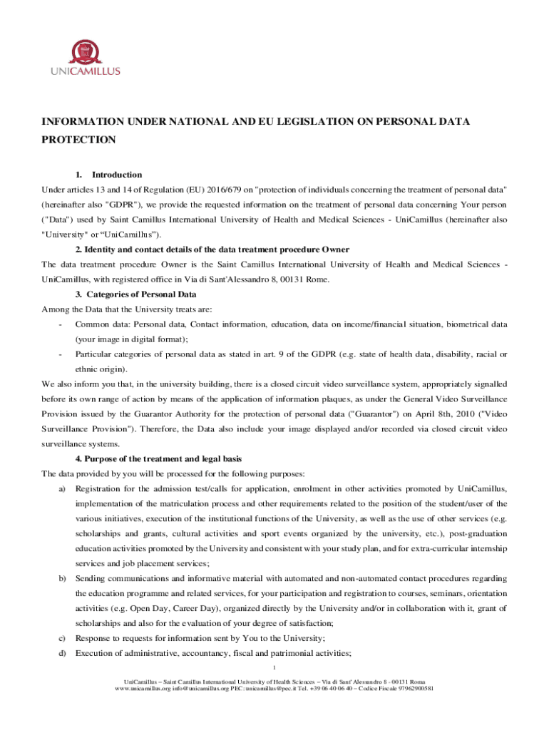 INFORMATION UNDER NATIONAL AND EU LEGISLATION ON PERSONAL DATA PROTECTION1. IntroductionUnder articles 13 and 14 of Regulation (EU) 2016/679 on “protection of individuals concerning the treatment