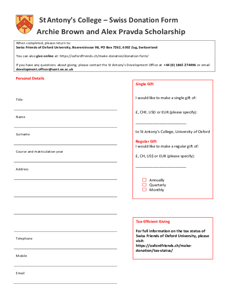 St Antony's College Swiss Donation Form Archie Brown and Alex Pravda Scholarship When completed, please return to: Swiss Friends of Oxford University, Baarerstrasse 98, PO Box 7262, 6302 Zug, Switzerland