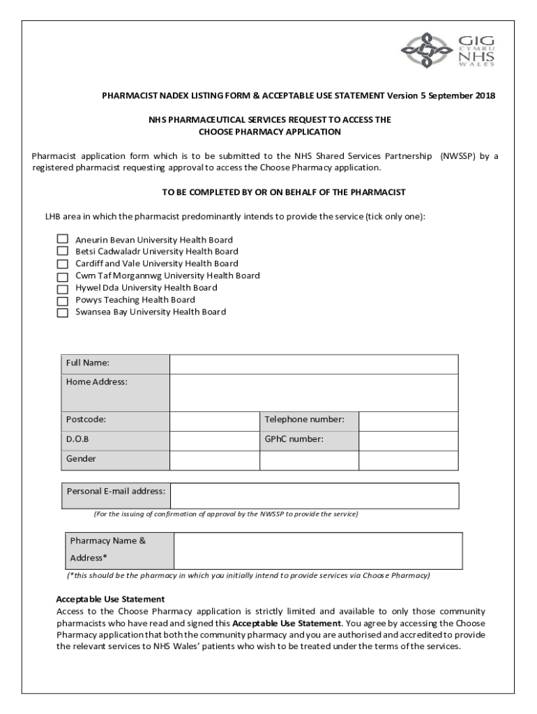 PHARMACIST NADER LISTING FORM & ACCEPTABLE USE STATEMENT Version 5 September 2018 NHS PHARMACEUTICAL SERVICES REQUEST TO ACCESS THE CHOOSE PHARMACY APPLICATION Pharmacist application form which is