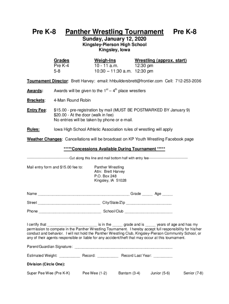 PRE K8Panther Wrestling Tournament K8Sunday, January 12, 2020, Kingsley Pierson High School Kingsley, Iowa Grades PRE K4 58WeighIns Wrestling (approx. start) 10 11 a.m. 12:30 pm 10:30 11:30 a.m. 12:30