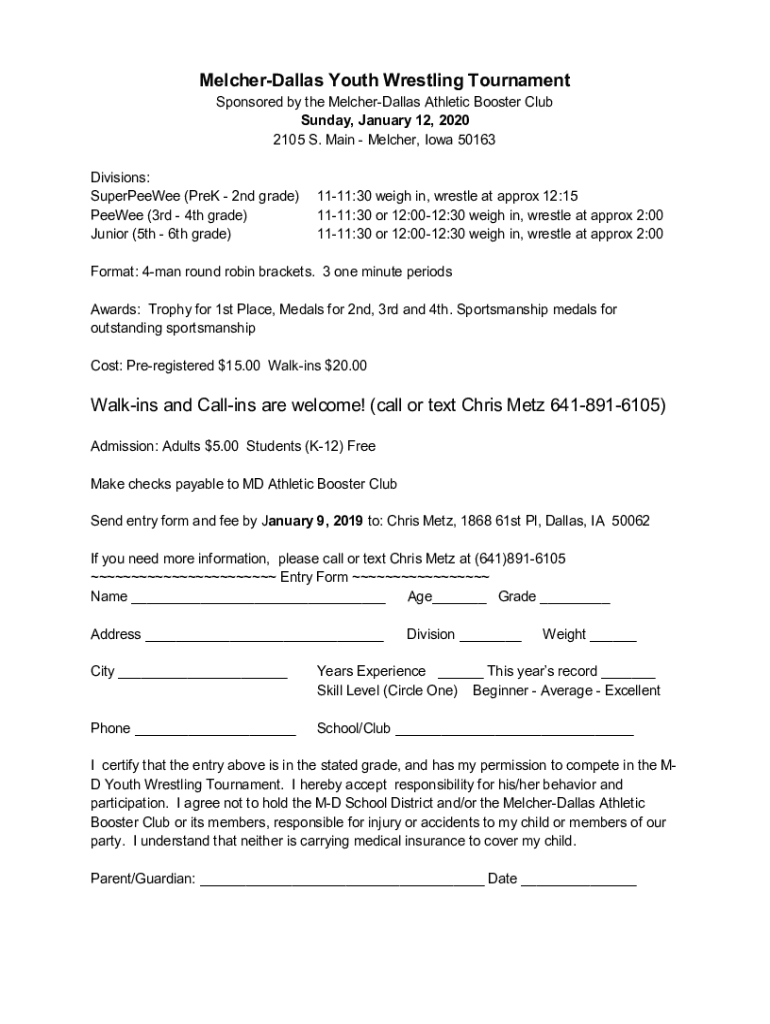 MelcherDallas Youth Wrestling Tournament Sponsored by the MelcherDallas Athletic Booster Club Sunday, January 12, 2020 2105 S. Main Belcher, Iowa 50163 Divisions: Superpower (Prey 2nd grade) Peewee
