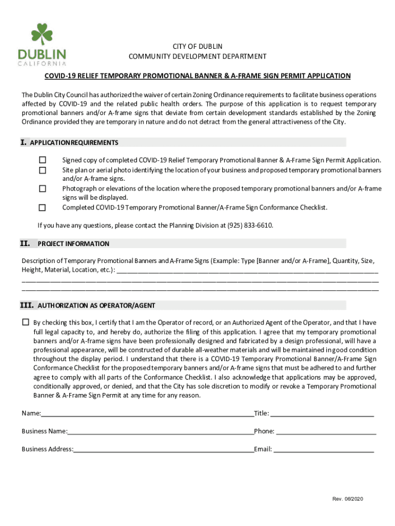 CITY OF DUBLIN COMMUNITY DEVELOPMENT DEPARTMENT COVID-19 RELIEF TEMPORARY PROMOTIONAL BANNER & FRAME SIGN PERMIT APPLICATION The Dublin City Council has authorized the waiver of certain Zoning Ordinance