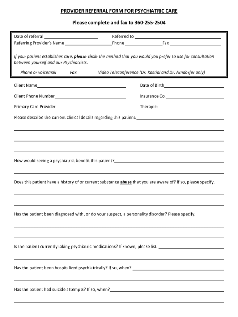 PROVIDER REFERRAL FORM FOR PSYCHIATRIC CARE Please complete and fax to 3602552504 Date of referral Referring Providers NameReferred to Phone Fax If your patient establishes care, please circle the