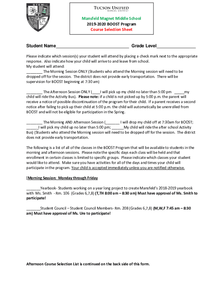 Mansfield Magnet Middle School 20192020 BOOST Program Course Selection SheetStudent Name Grade Level Please indicate which session(s) your student will attend by placing a check mark next to the appropriate