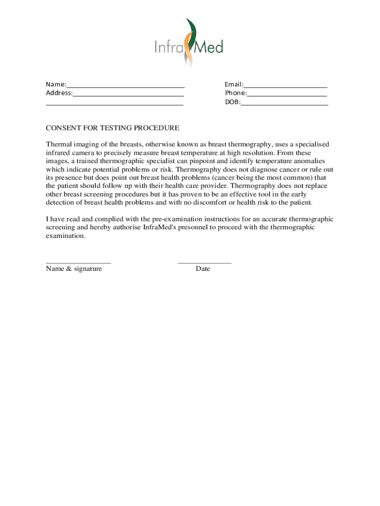 Name: Address: Email: Phone: DOB: CONSENT FOR TESTING PROCEDURE Thermal imaging of the breasts, otherwise known as breast thermographic, uses a specialized infrared camera to precisely measure breast