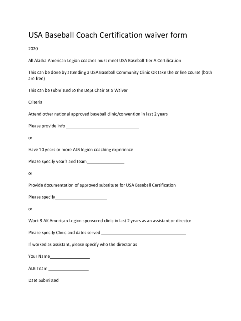 USA Baseball Coach Certification waiver form 2020 All Alaska American Legion coaches must meet USA Baseball Tier A Certification This can be done by attending a USA Baseball Community Clinic OR take