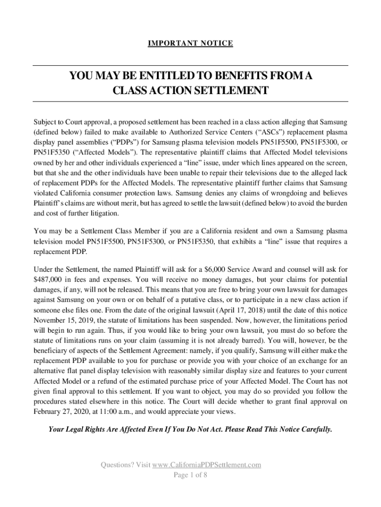 Subject to Court approval, a proposed settlement has been reached in a class action alleging that Samsung