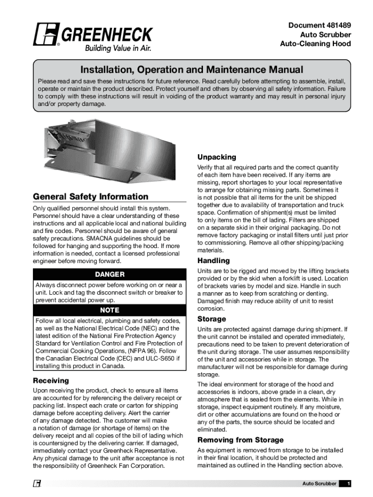 Auto-loading HoodInstallation, Operation and Maintenance Manual