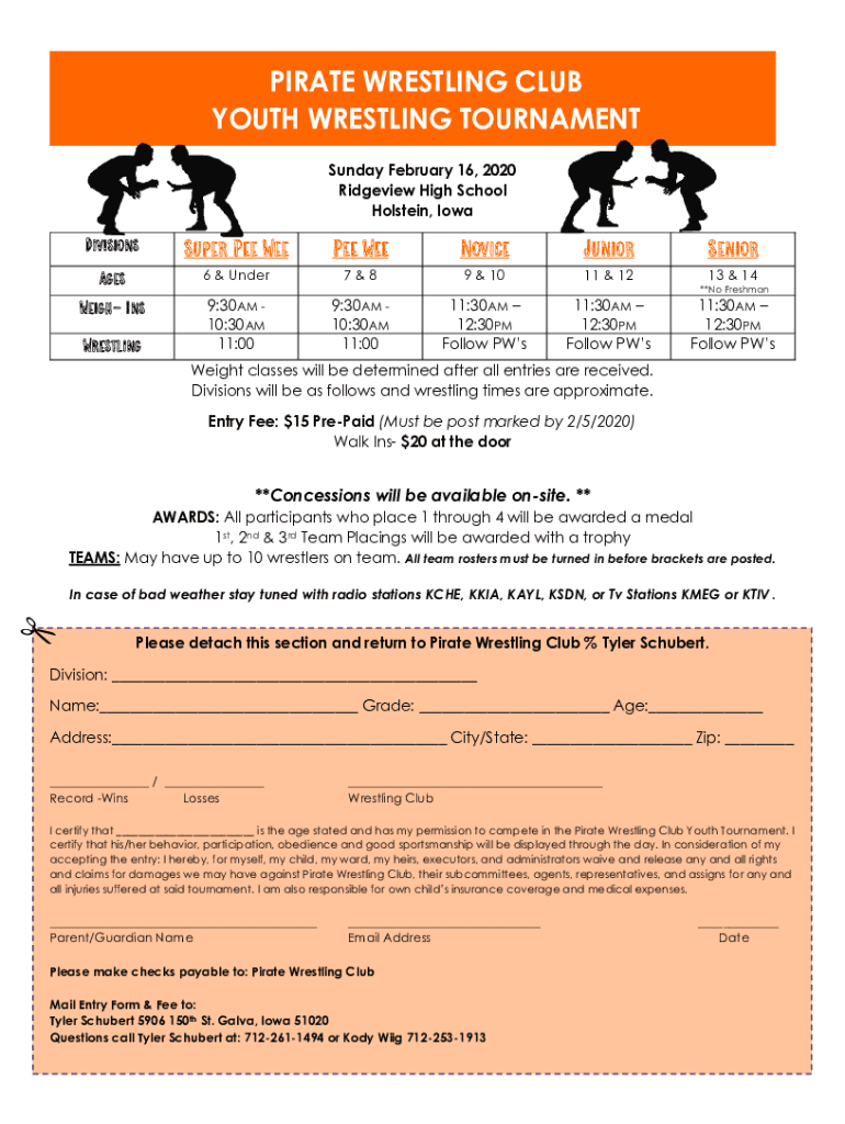 PIRATE WRESTLING CLUB YOUTH WRESTLING TOURNAMENT Sunday, February 16, 2020, Ridge view High School Holstein, Iowa DivisionsSuper Pee Weeper WeeNoviceJuniorAges6 & Under7&89 & 1011 & 12Weigh Ins9:30AM