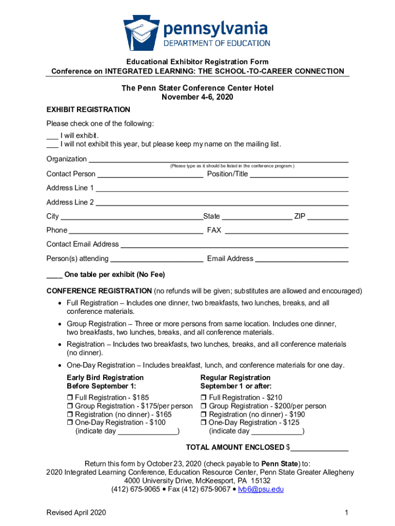 Educational Exhibitor Registration Form Conference on INTEGRATED LEARNING: THE SCHOOLTOCAREER Connection Penn Stater Conference Center Hotel November 46, 2020 EXHIBIT REGISTRATION Please check one
