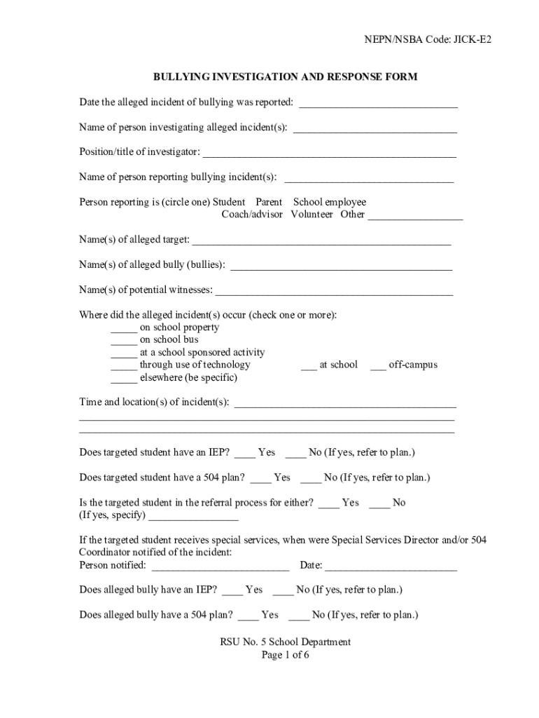 NEON/NSA Code: JICKE2 BULLYING INVESTIGATION AND RESPONSE FORM Date the alleged incident of bullying was reported: Name of person investigating alleged incident(s): Position/title of investigator: