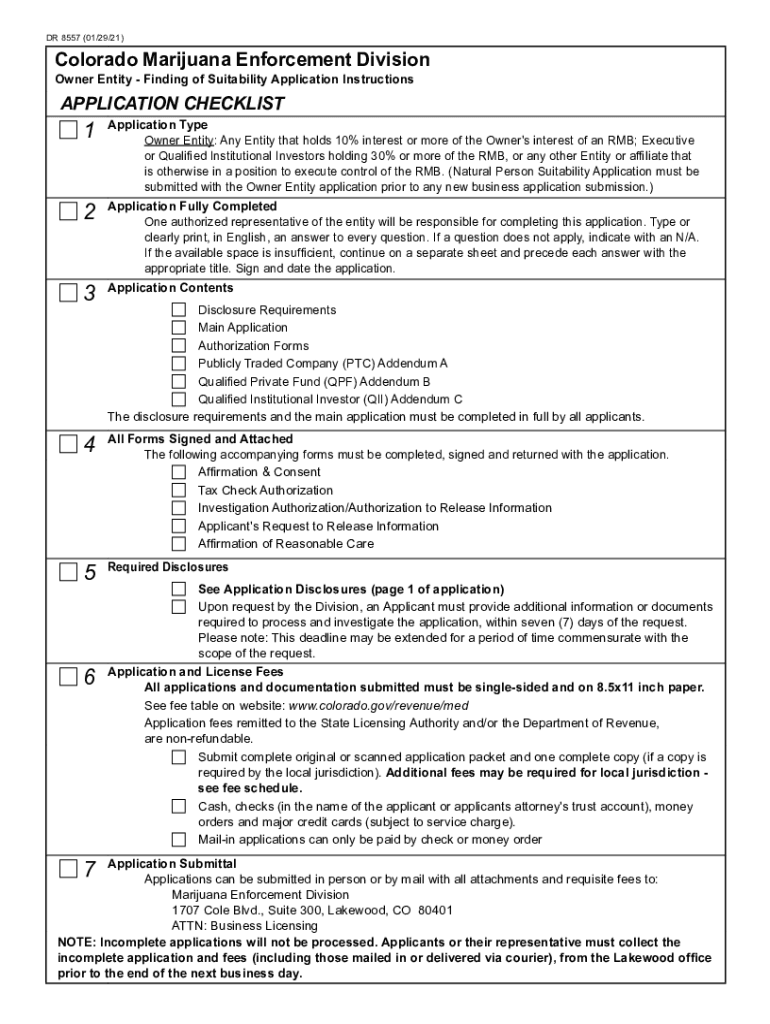 Marijuana Finding of Suitability Application Owner EntityMarijuana Enforcement Division DR 8557 (01/29/21)DR 8557 (01/29/21)Colorado Marijuana Enforcement Division Owner Entity Finding of Suitability