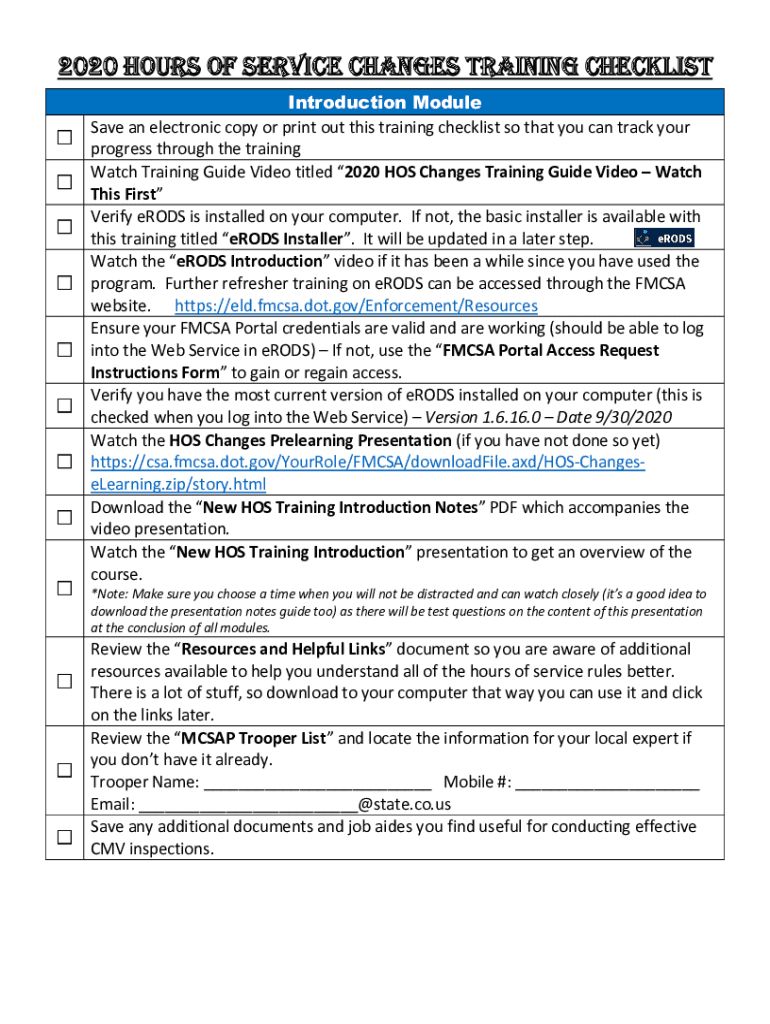 2020 Hours of Service Changes Training Checklist Introduction Module Save an electronic copy or print out this training checklist so that you can track your progress through the training Watch Training