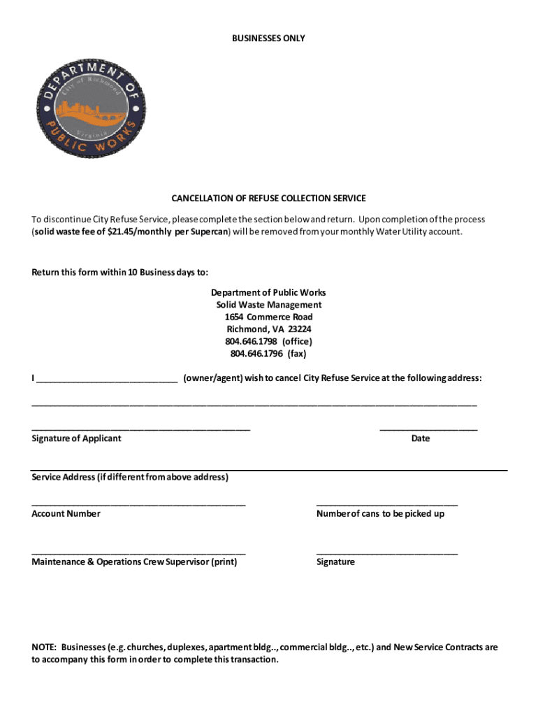 BUSINESSES ONLYCANCELLATION OF REFUSE COLLECTION SERVICE To discontinue City Refuse Service, please complete the section below and return. Upon completion of the process (solid waste fee of $21.45/monthly