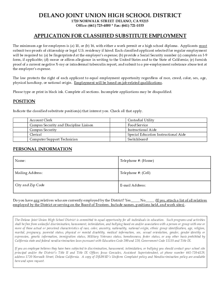 Office: (661) 7254000 * Fax: (661) 7211033APPLICATION FOR CLASSIFIED SUBSTITUTE EMPLOYMENT