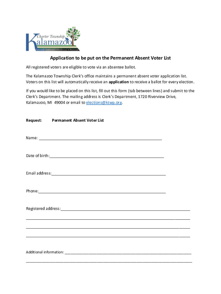 The Kalamazoo Township Clerks office maintains a permanent absent voter