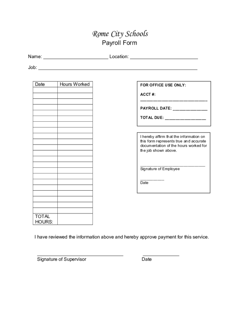 Rome City Schools Payroll Form Name: Location: Job: Gatehouse Worked OFFICE USE ONLY: ACCT #: PAYROLL DATE: TOTAL DUE: I hereby affirm that the information on this form represents true and accurate