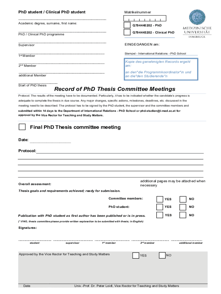 PhD student / Clinical PhD studentMatrikelnummer Academic degree, surname, first name:Q794440202 PhD / Clinical PhD programmeQ794445202 Clinical PhD SupervisorEINGEGANGEN am: 1st MemberStempel International