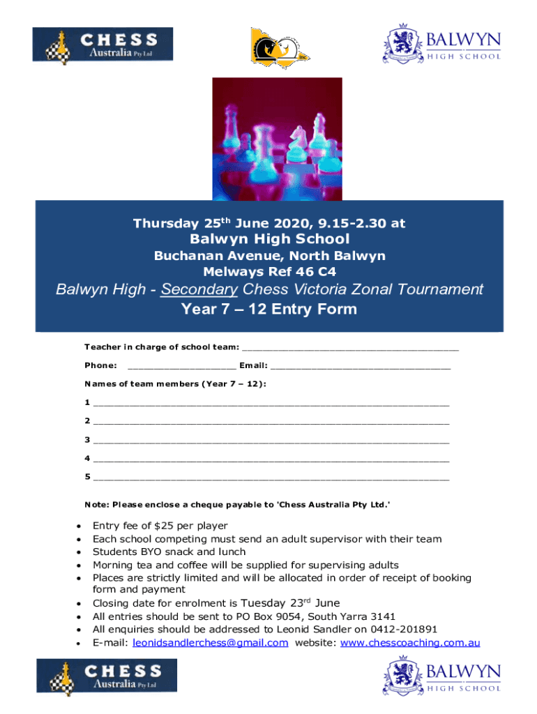 Thursday 25th June 2020, 9.152.30 atBalwyn High School Buchanan Avenue, North Baldwin Mel ways Ref 46 C4Balwyn High Secondary Chess Victoria Zonal Tournament Year 7 12 Entry Form Teachers in charge