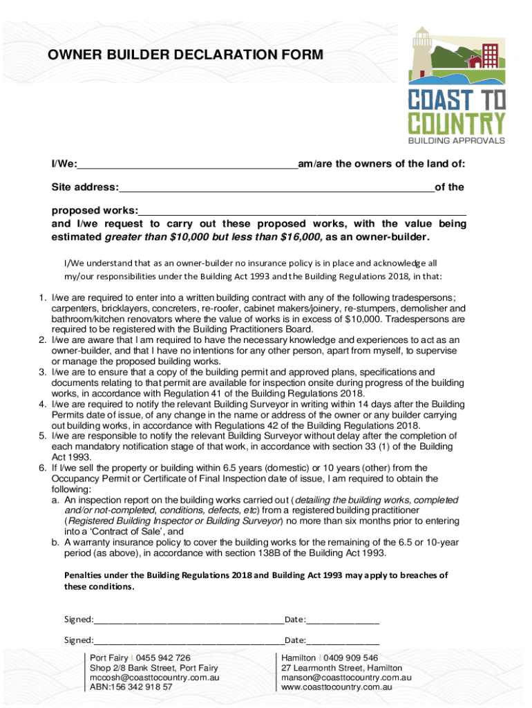 OWNER BUILDER DECLARATION FORM/We: am/are the owners of the land of: Site address: of the proposed works: and I/we request to carry out these proposed works, with the value being estimated greater