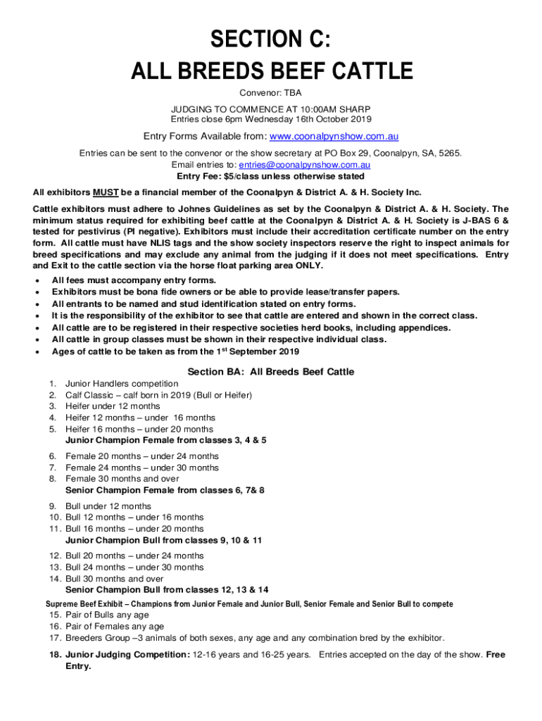 SECTION C: ALL BREEDS BEEF CATTLE Convenor: TBA JUDGING TO COMMENCE AT 10:00AM SHARP Entries close 6pm Wednesday 16th October 2019Entry Forms Available from: www.coonalpynshow.com.au Entries can be