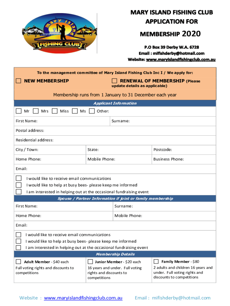 2020To the management committee of Mary Island Fishing Club Inc I / We apply for:NEW MEMBERSHIPRENEWAL OF MEMBERSHIP (Please