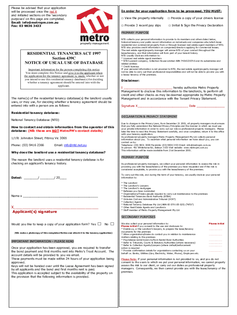 Please be advised that your application will be processed once the red X and initialed sections on the secondary purposes on this page are completed. Email: info metropm.com.AU Fax: 03 9836 3433In