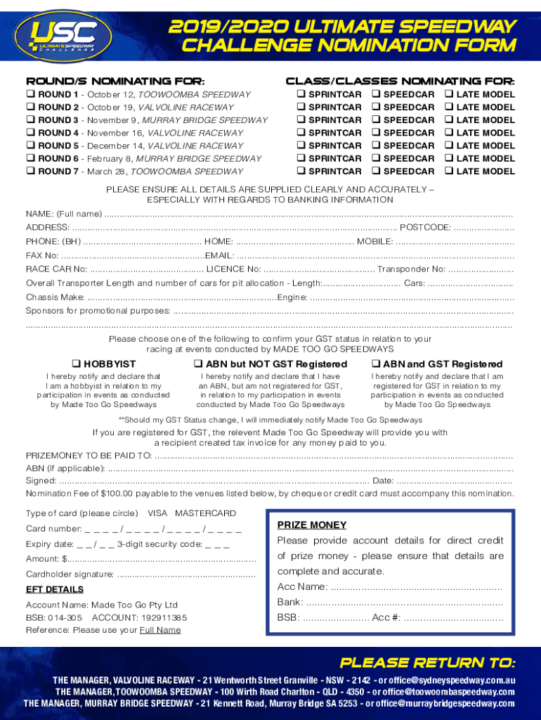 2019/2020 ULTIMATE SPEEDWAY CHALLENGE NOMINATION FORM ROUND/S NOMINATING FOR:q ROUND 1 October 12, TOOWOOMBA SPEEDWAY q ROUND 2 October 19, VALVOLINE RACEWAY q ROUND 3 November 9, MURRAY BRIDGE SPEEDWAY