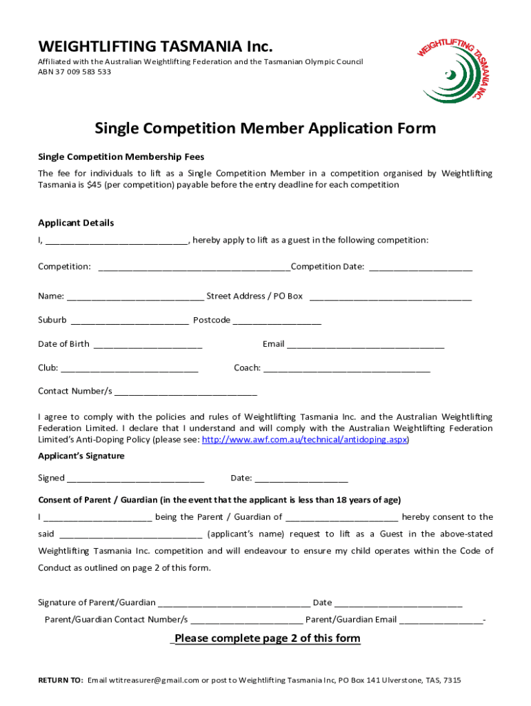 WEIGHTLIFTING TASMANIA Inc. Affiliated with the Australian Weightlifting Federation and the Tasmanian Olympic Council ABN 37 009 583 533Single Competition Member Application Form Single Competition