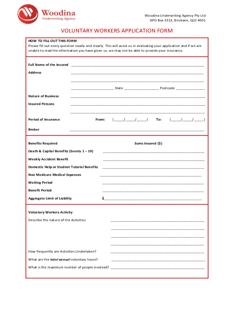 Wooding Underwriting Agency Pty Ltd GPO Box 3313, Brisbane, QLD 4001VOLUNTARY WORKERS APPLICATION FORM HOW TO FILL OUT THIS FORM Please fill out every question neatly and clearly. This will assist