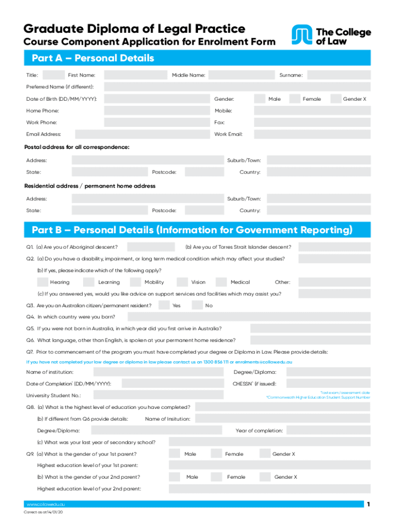 Graduate Diploma of Legal PracticeCourse Component Application for Enrollment Form Part A Personal Details Title:First Name:Middle Name:Surname:Preferred Name (if different): Date of Birth (DD/MM/YYY):Gender:Malone