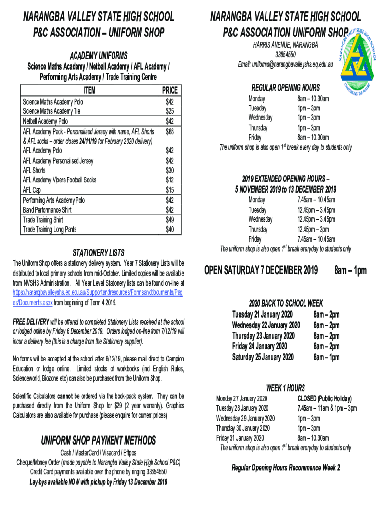 PARANOIA VALLEY STATE HIGH SCHOOL P&C ASSOCIATION UNIFORM SHOPNARANGBA VALLEY STATE HIGH SCHOOL P&C ASSOCIATION UNIFORM SHOPACADEMY UNIFORMSHARRIS AVENUE, PARANOIA 33854550 Email: uniforms narangbavalleyshs.EQ.edu.science