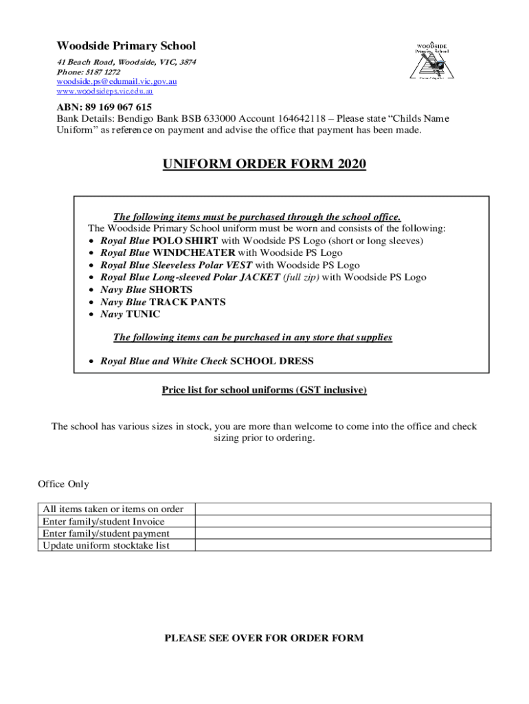 Woodside Primary School 41 Beach Road, Woodside, VIC, 3874 Phones: 5187 1272 woodside.ps email.Vic.gov.AU www.woodsideps.vic.edu.auABN: 89 169 067 615 Bank Details: Bendigo Bank BSB 633000 Account