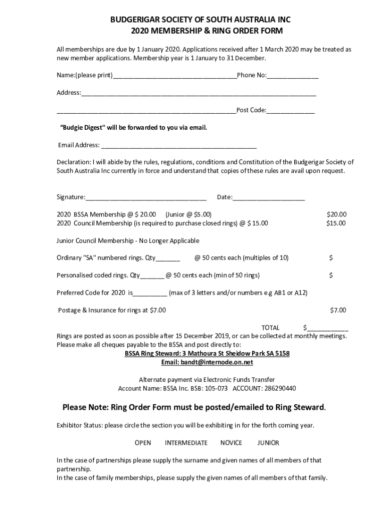 BUDGERIGAR SOCIETY OF SOUTH AUSTRALIA INC 2020 MEMBERSHIP & RING ORDER FORM All memberships are due by 1 January 2020. Applications received after 1 March 2020 may be treated as new member applications.