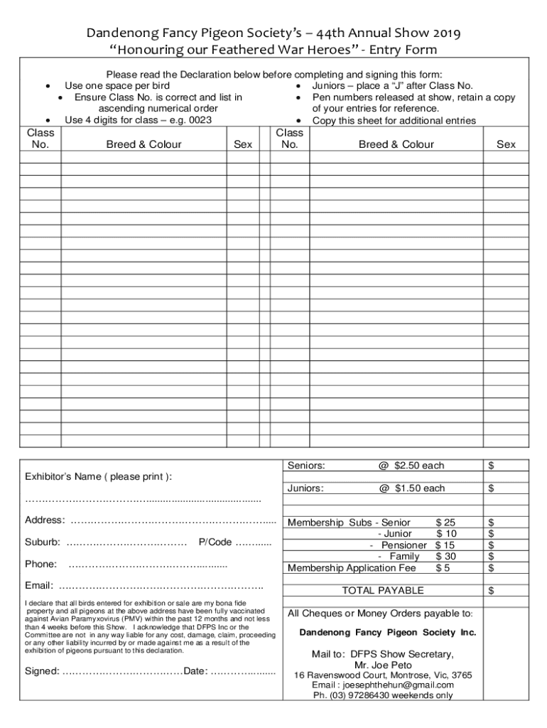 DandenongFancyPigeonSocietys44thAnnualShow2019 HonouringourFeatheredWarHeroesEntryForm Please read the Declaration below before completing and signing this form: Juniors place a J after Class No.