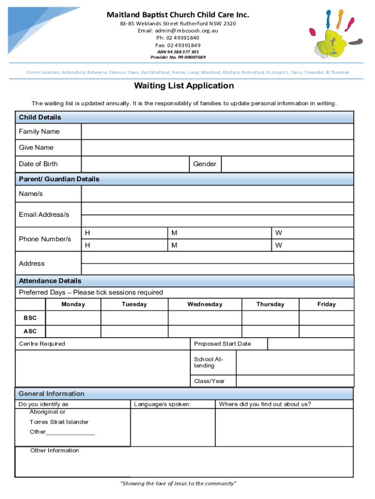 Maitland Baptist Church Child Care Inc. 8385 Wetlands Street Rutherford NSW 2320 Email: admin boost.org.AU pH: 02 49391840 Fax: 02 49391849 ABN 94 288 377 301 Provider No. PR00007689 Center locations: