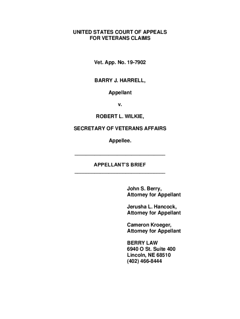 UNITED STATES COURT OF APPEALS FOR VETERANS Claimed. App. No. 197902BARRY J. HARRELL, Appellant v. ROBERT L. WILKIE, SECRETARY OF VETERANS AFFAIRS Appealed. APPELLANTS BRIEF John S. Berry, Attorney