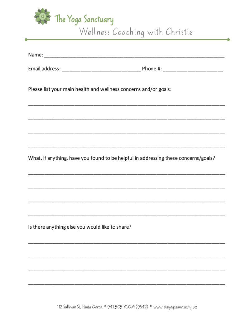 The Yoga SanctuaryWellness Coaching with Christie Name: Email address: Phone #: Please list your main health and wellness concerns and/or goals: What, if anything, have you found to be helpful in