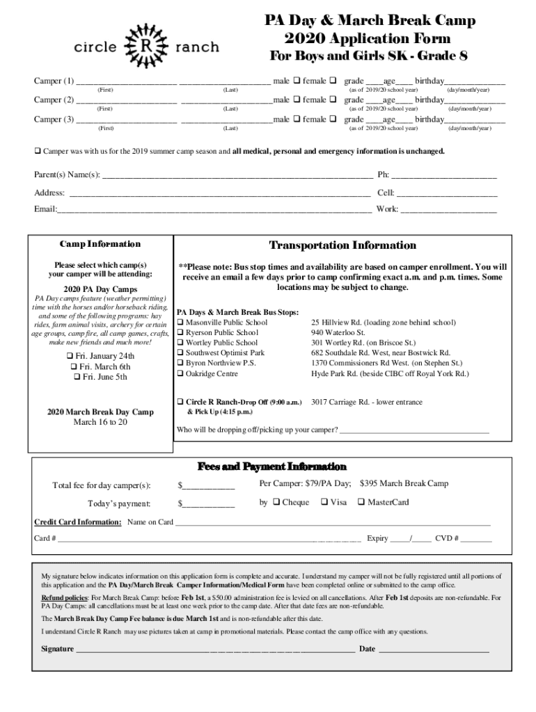PA Day & March Break Camp 2020 Application Form For Boys and Girls SK Grade 8 Camper (1) male female grade age birthday (First)(Last)(as of 2019/20 school year)(day/month/year)Camper (2) male female