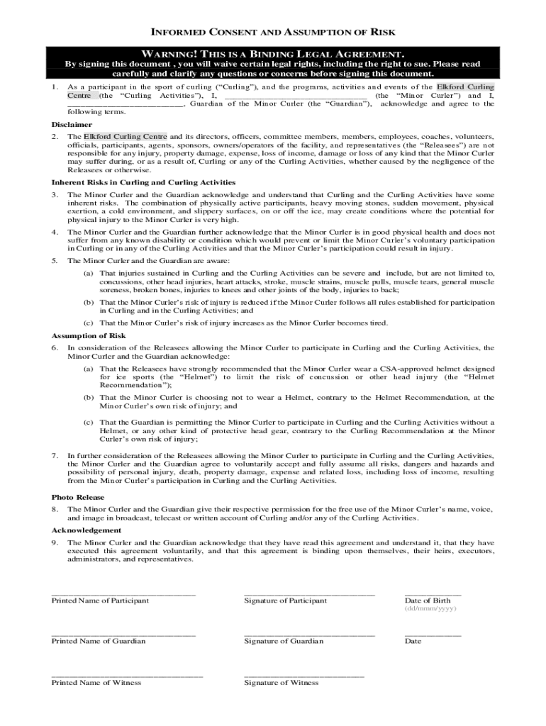 INFORMED CONSENT AND ASSUMPTION OF RISK WARNING! THIS IS A BINDING LEGAL AGREEMENT. By signing this document, you will waive certain legal rights, including the right to sue. Please read carefully