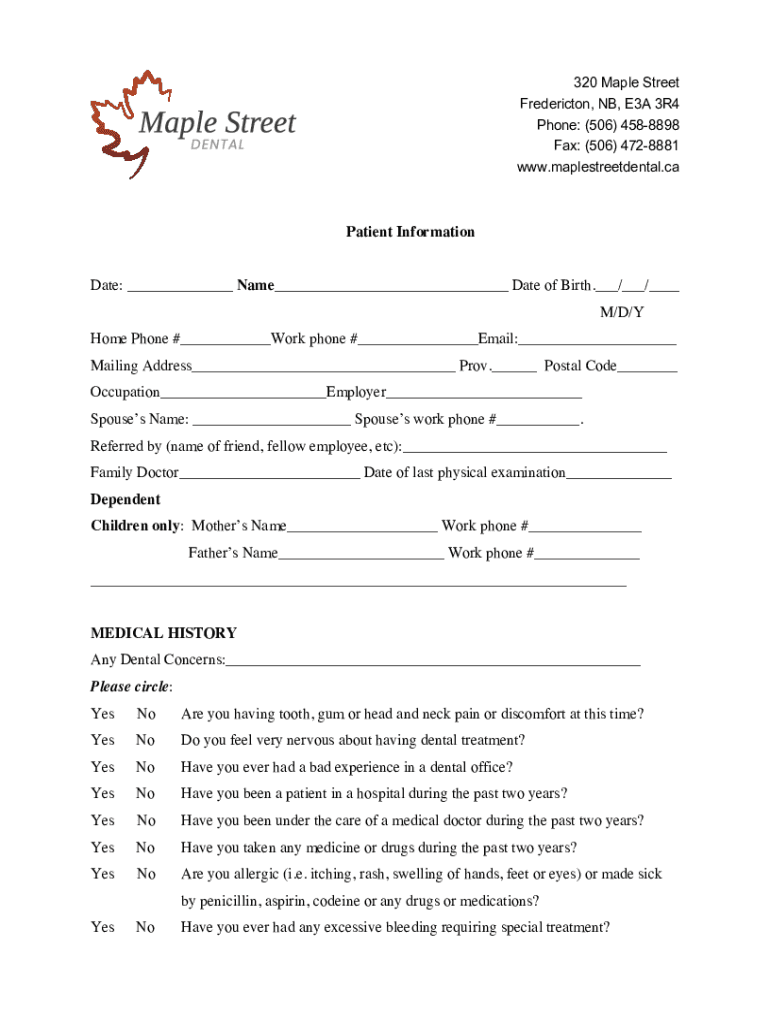 320 Maple Street Fredericton, NB, E3A 3R4 Phone: (506) 4588898 Fax: (506) 4728881 www.maplestreetdental.caPatient Information Date: Name Date of Birth. / / M/D/Y Home Phone # Work phone # Email: Mailing