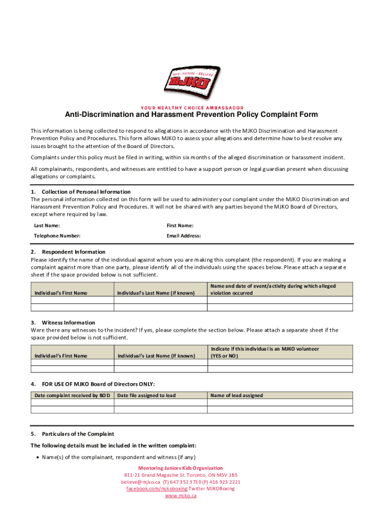 This information is being collected to respond to allegations in accordance with the MJ KO Discrimination and Harassment